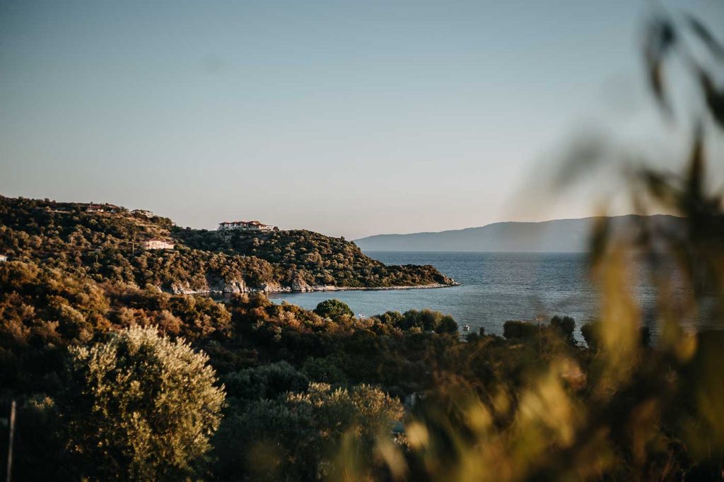 Ένα μαγευτικό σύμπλεγμα κτισμάτων στην πλαγιά ενός λόφου, με θέα τα γαλαζοπράσινα νερά του Αιγαίου και του όρους Άθως, χωρισμένα σε αυτόνομες βίλες ανάμεσα στους ελαιώνες, σε ένα κτήμα 12 στρεμμάτων μόλις 100 μέτρα από την ομορφότερη παραλία του νησιού, τις Αλυκές.